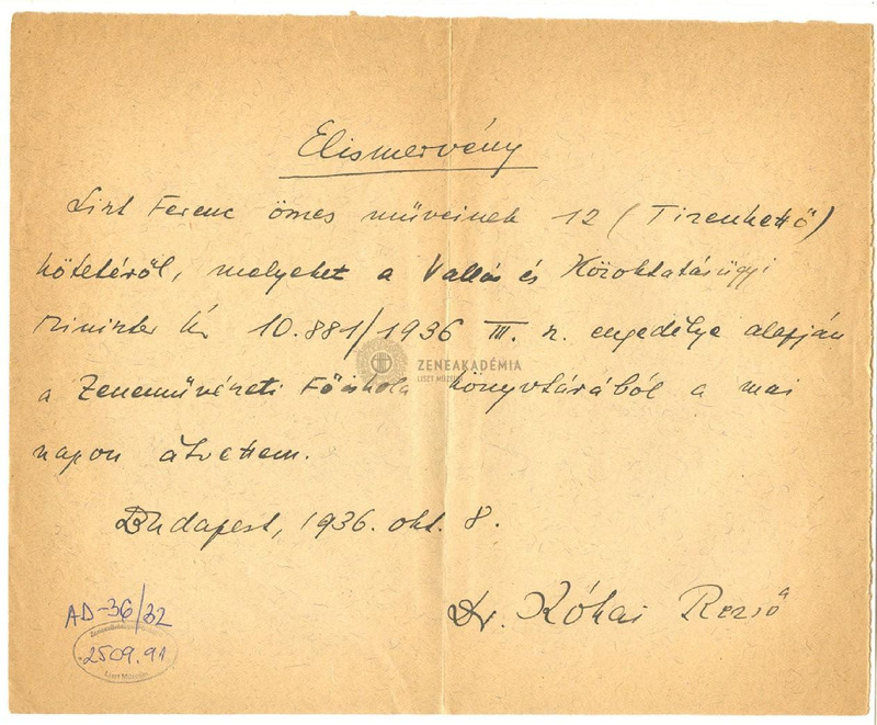 - Dr.Rezső Kókais receipt of 12 volumes of the Liszt complete edition from the library of the Academy of Music, based on the miinisterial order.