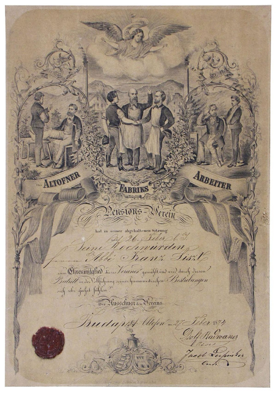 Diploma of the Provident Society of the Factory Workers of Old Buda of Liszts election as honorary member.