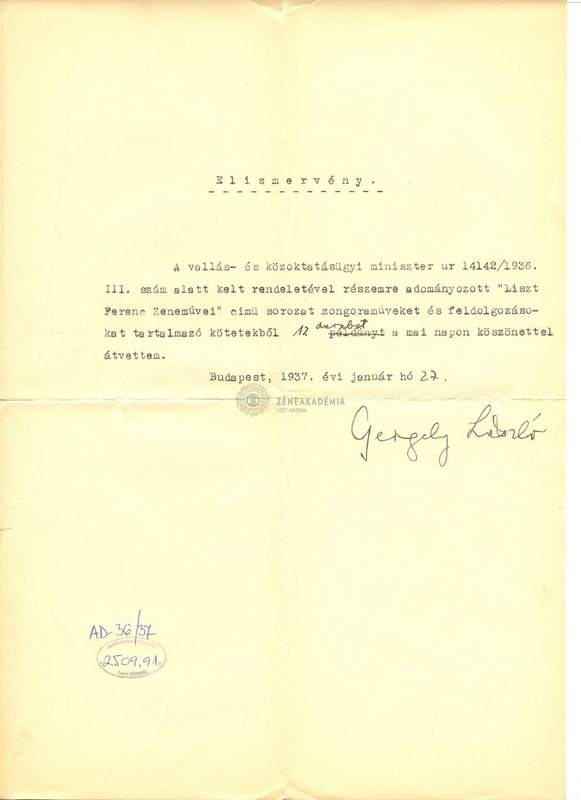 - László Gergelys receipt of 12 volumes of “Piano Works” and “Arrangements” of the Liszt complete edition.