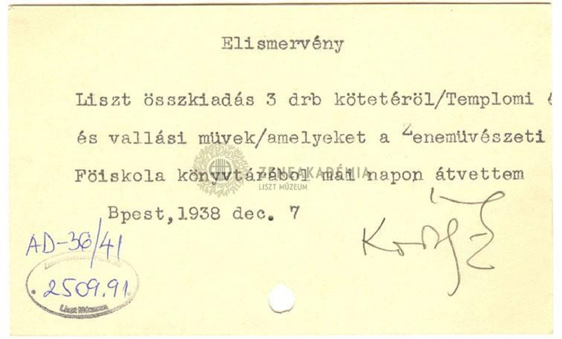 - Zoltán Kodálys receipt of 3 volumes of "Sacred Choral Music" of the Liszt complete edition.