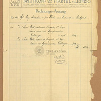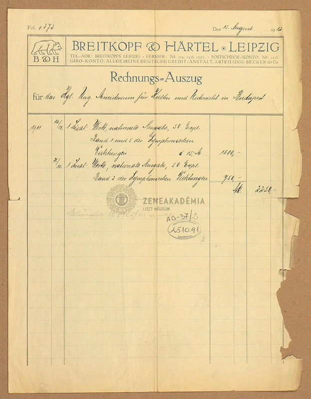 Statement of account issued by Breitkopf & Härtel to the Ministry of Education and Culture concerning vols. 1, 6, and 7 of the series "Symphonic poems" of the Liszt complete edition. On the back a hand-written note, not quite readable. Dated 27 Jan. 1913, conversion of 5250 Marks to 6184 crown 50 fillér.
