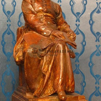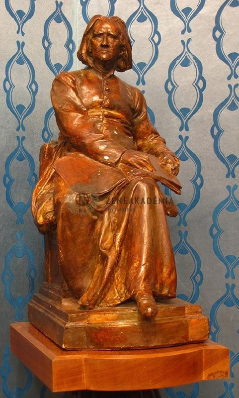 Sitting in a chair, Liszt is leaning back and looking slightly upwards, holding an exercise book with both hands on his knee.
