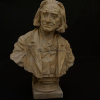 It shows the old Liszt wearing a coat and leaning a bit forward. His hair is brushed back, his features are sharp. The statue stands on a round pedestal with a square base. Inscribed on the back: „nach der Natur modellirt Tilgner 1884”.