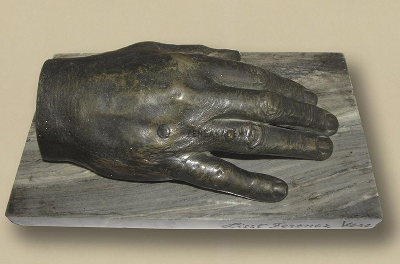 Liszt’s right hand. Bronze, on rectangular grey marble base. Inscription at the wrist: “Strobl”, on the marble: “Liszt Ferencz keze” [Ferencz Liszt’s hand]. On his ring finger there is a wart.