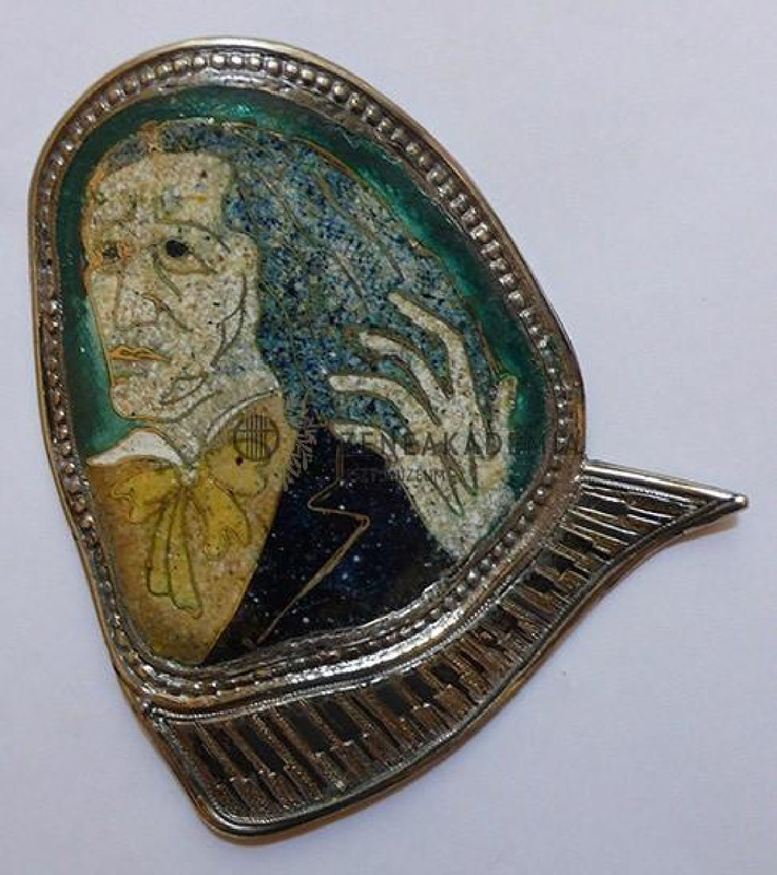 - Irregular-shaped single-sided medal. Its upper part is a colourful vitreous enamel showing Liszt in tails; the lower part displays the piano keyboard.