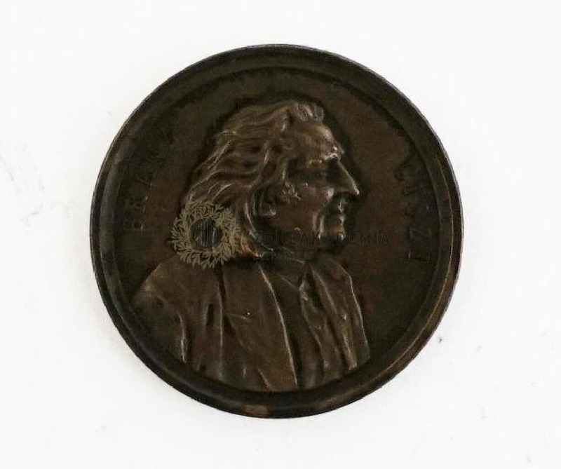 Double-sided-medal. On the obverse: Liszt’s half-length portrait looking right (coat, cassock, collar). Circular inscription on the left: „FRANZ”, on the right: „LISZT”. On the reverse: laurel wreath with inscription divided into six parts. The wreath is bisected by a flower and a horizontal line. Inscribed: “GEBOREN / IN / RAIDING 1811 / Zu / BAYREUTH 1886”. Its rim is smooth.