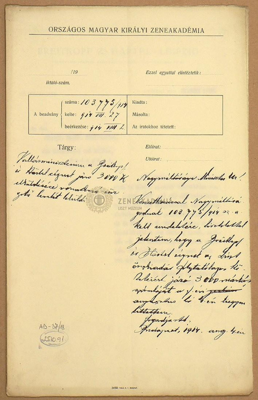 Letter of the Academy of Music to the Royal Hungarian Ministry of Religion and Public Education about the transfer of 3,000 marks to Breitkopf & Härtel on 4 Aug. 1914 for the volumes of the Liszt complete edition.