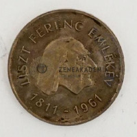 Double-sided coin. On the obverse: the old Liszt in right profile. Circular inscription: “LISZT FERENC EMLÉKÉVE 1811-1886”. On the reverse: a lyre, above it in three lines: “ 50 / FORINT / BP”. Under the lyre: “1961” Circular inscription: “MAGYAR NÉPKÖZTÁRSASÁSÁG” [Hungarian Peoples Pepublic] On the rim: “M.Á.P.V.”.
