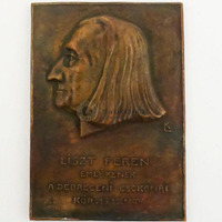 Single-sided plaquette depicting the old Liszt in left profile. Signed beside his hair on the right. At the bottom an inscription in 4 lines, and a thin rim round. Caption: „LISZT FERENC / EMLÉKÉNEK / A DEBRECENI CSOKONAI / KÖR. 1935. NOV” [In memory of Liszt, the Csokonai Circle of Debrecen, Nov. 1935] On the reverse: in the left corner: „KUPINSZKY / DEBRECEN”