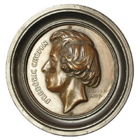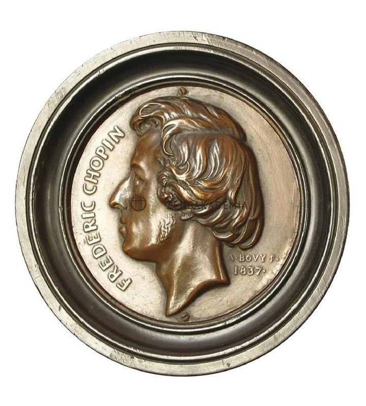 Dark brownish bas-relief made of sheet-metal. Chopin is looking to the left. On the left the inscription in semicircle: “FREDERIC CHOPIN”. At the bottom on the right: “A. BOVY / 1837”. Fastened with two screws to a black wooden frame.