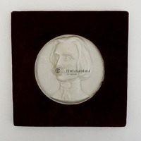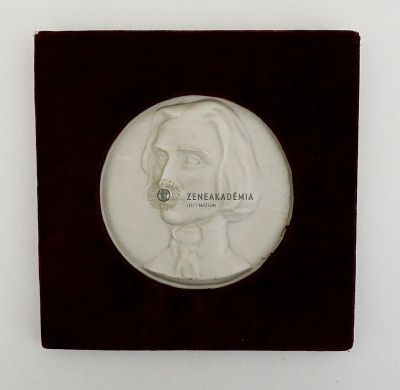 Single-sided medal fixed to a wooden case with velvet lining. It shows the portrait of the young Liszt turned slightly to the left. He is wearing a high-collared shirt, a tie and a coat. Inscribed on the right: “LISZT”. On the reverse: “HEREND / 5821” (the etched number of the production)