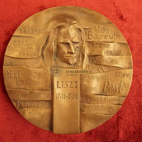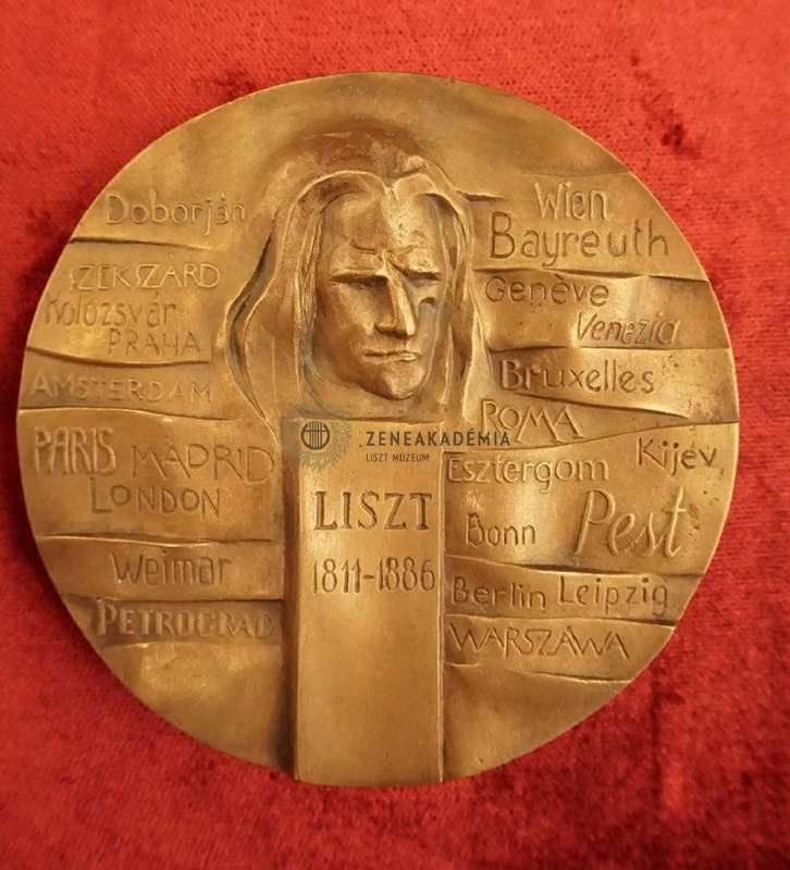 Double-sided medal. Obverse: in the middle there is a stone pillar with inscriptions and Liszt’s head on it. On both sides parallel, ribbon-like formations with the names of the famous towns of Liszt’s career written in concave and convex letters. Inscribed: “LISZT / 1811-1886”. On the reverse: a piano with the lid open. At the bottom on the right a signature, on the top left-had side a caption in 4 lines: „EM- / LÉKE- / ZETÜL / 1986ban”