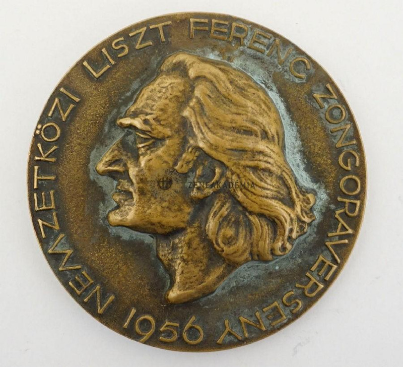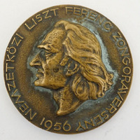 Double-sided medal. On the obverse: portrait of the old Liszt in left profile with the impression at his neck: “REMÉNYI”. Circular inscription: “NEMZETKÖZI LISZT FERENC ZONGORAVERSENY 1956” [International Liszt Piano Competition 1956]. On the reverse: a woman kneeling on one knee and looking to the left. She is wearing a veil-like dress that leaves her breast uncovered. Her hair is gathered up in a knot; she turns her head upwards. In her right hand she is holding a wreath, in her left a lute. Inscribed at the bottom: “BUDAPEST / 1956” Rim: smooth.