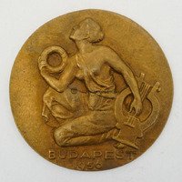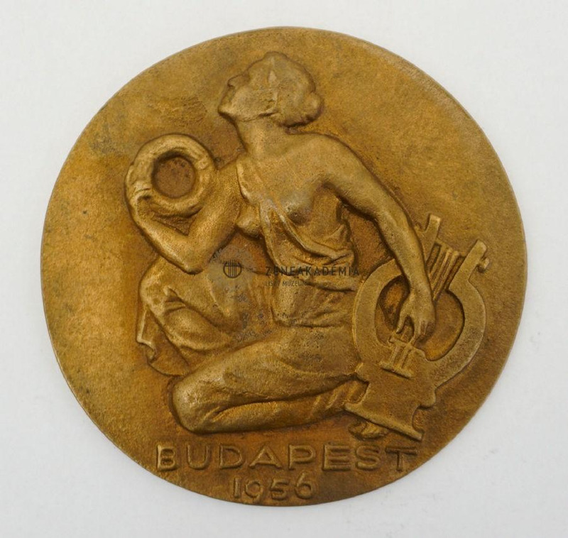 Single-sided medal showing a kneeling woman looking left. She is wearing a veil-like dress that leaves her breast uncovered. Her hair is gathered up in a knot, she turns her head upwards. In her right hand she is holding a wreath, in her left a lute. Inscribed at the bottom: “BUDAPEST / 1956”