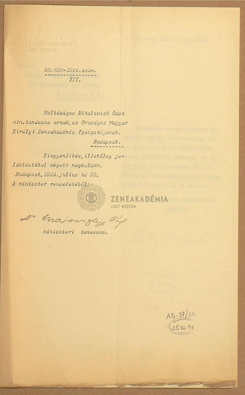 Letter of the ministerial advisor to Ödön Mihalovich, director of the Academy of Music, concerning the payment for the Liszt edition and demanding report.