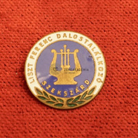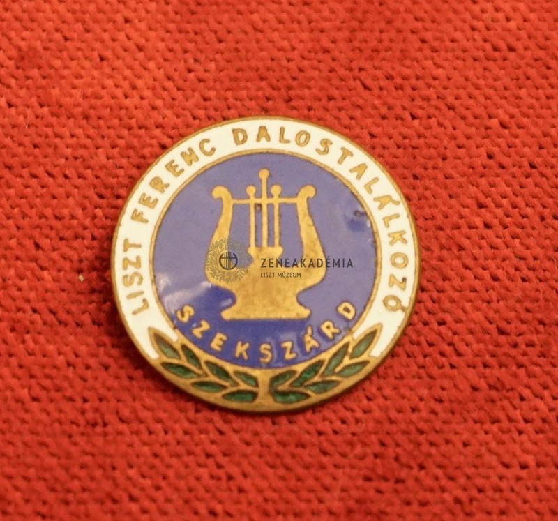- Gold lyre against a blue background; below green laurel branches. Text against white background: “Liszt Ferenc Dalostalálkozó” [Franz Liszt singers’ meeting]