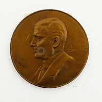 Double-sided medal. On the obverse: portrait of the composer looking to the left. Inscribed on the right side: “Jean Sibelius”. Signed below the collar: “Ville Vallysen, Bertel Berlin”. The reverse shows a female figure with a child holding a trumpet in her right hand and clasping the child by her left. With its right hand the child points to the map of Europe. Circular inscription: “NOSTRA SONIS EXPRESSIT”. Inscribed below: „QUINQUANGENAR 10 / MUSICES PATRIAE / AMICI DEDICAVERUNT / A. MCMXV”