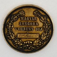 Medal awarded at the Hungarian piano competition of Antal Siposs music school. Double-sided medal. On the obverse: “Magyar Zongoraverseny Díj 1873. július 13.” [Award of the Hungarian piano competition 13 July 1873]. Around it a wreath . On the reverse: “Siposs Antal Felsőbbképzésű Zeneintézetének Tanítványai” [Students of Antal Siposs institute of higher music education]. In the middle: a four-stringed lyre. In a case.