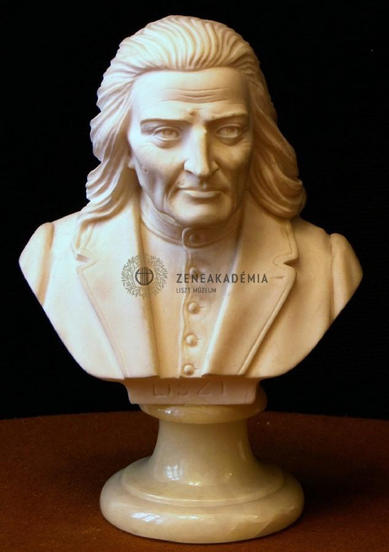 Dull white standing on a pedestal made of a different ceramic matter and glued. It shows Liszt dressed as an abbé. He is middle-aged and facing the viewer. Signed “A. Gimmeli”. The paper emblem stuck to the lower part of the pedestal has the inscription in blue letters on golde basis: “MADE IN ITALY”