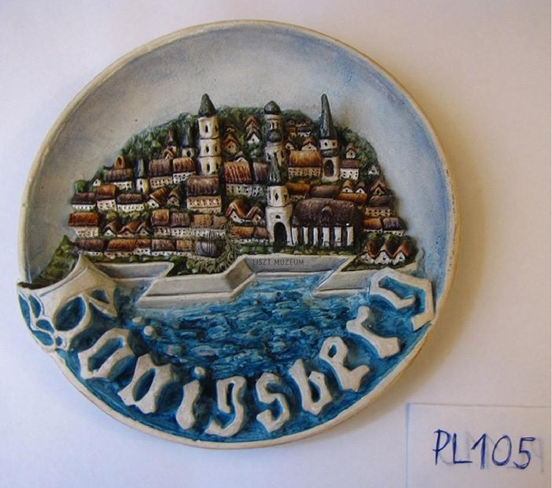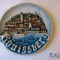 - Oval-shaped painted plaster bas-relief which can be hanged on the wall. In the foreground blue water can be seen with the semicircular inscription: “Königsberg”. Brownish roofs, in the background green trees.