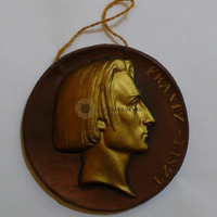 Representation of the young Liszt in right position. Golden medal on a brown base. Inscribed at the bottom on the left: “Bovy A. 1840”. On the right round it: “FRANTZ LISZT”. There are two pieces available.