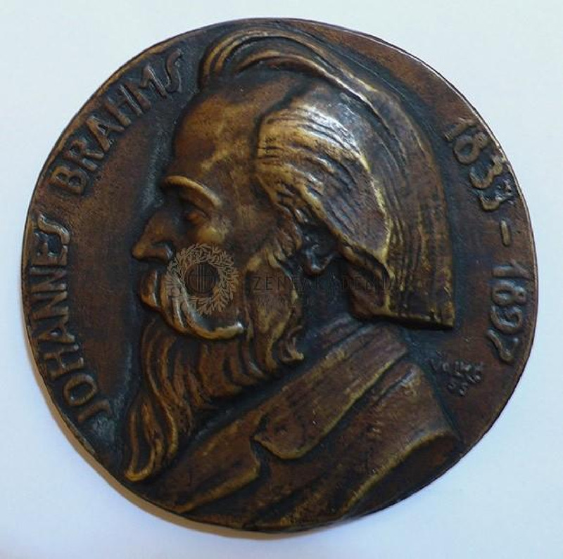 Round plaquette with the half-length portrait of Brahms in the middle, seen from the left. He has neck-long, straight hair, a moustache and a beard. Inscription around: “Johannes Brahms 1833-1897”. At the side in small letters: “Valkó 55”