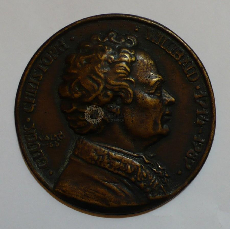 Round plaquette with Gluck’s half-length portrait in the middle showing him from the right. He faces the viewer. He has short, curly hair. Circular inscription: “Gluck Christoph – Willibald 1714-1787” Aside is a caption: „Valkó 55”