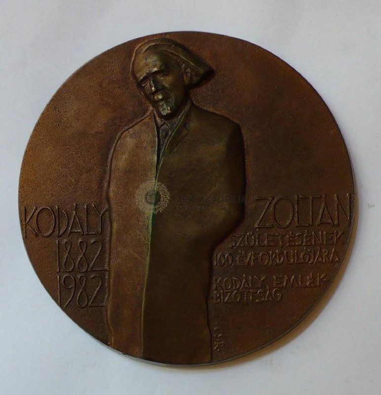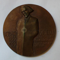 Double-sided plaquette in drab leather case. On the obverse: half-length portrait of Kodály in coat, tilting his head to the right. Inscription on the left: “Kodály 1882-1982”, on the right: „Zoltán születésének 100. évfordulójára Kodály Emlékbizottság” [For the 100th anniversary of Kodálys birth. Kodály Commemorative Committee]. On the reverse: Jesus expels the tradesmen – Jesus stands on top of the stairs with a whip and the tradesman flee.