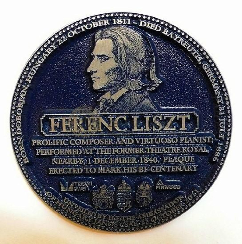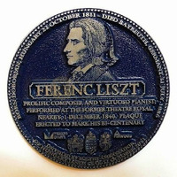 - In memory of Liszts concert in Liverpool. Silver picture and the inscription “Liszt Ferenc” against a black painted background, in frame. Under it an English text with the date of Liszt’s concert. At the bottom 5 coat-of arms.