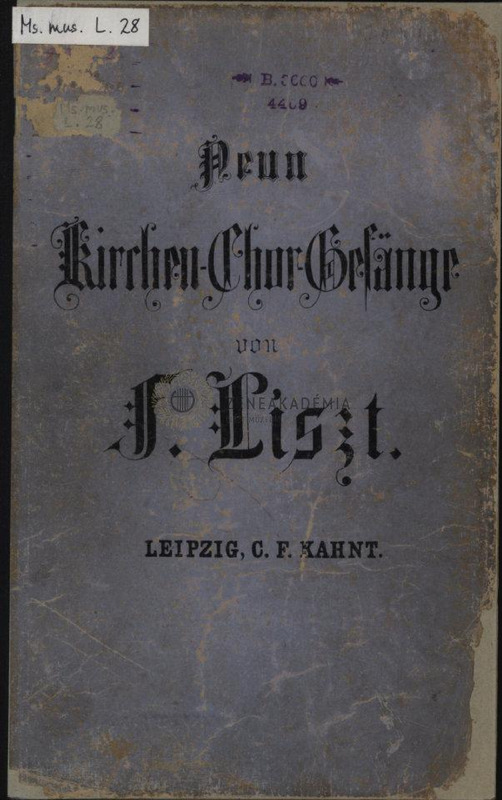 I. Pater noster; II: Ave Maria; III. O Salutaris; IV. Tantum Ergo (Frauen-Stimmen); IV. Tantum Ergo (Männer-Stimmen); V. Ave Verum; VI. Mihi autem adhaerere;VII. Ave Maris Stella (Gemischter Chor);VII. Ave Maris Stella (Männer-Stimmen); VIII. O Salutaris (in E); IX. Libera me. With Liszts inserts. 2 copies, the 2nd with different shelf number, without title page.