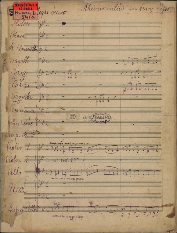 Transcription of Liszts chorus Rheinweinlied for mail voices and symphonic orchestra by Károly Huber. On the verso of folio 17: "Bevégeztem Harasztiban 1884 július 22én, Huber Károly." [Finished in Haraszti on July 22nd, 1884]