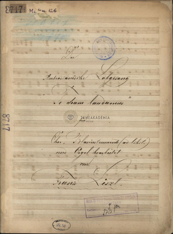 "Der Ambrosianische Lobgesang Te Deum laudamus für Chor, Blasinstrumente (ad libit.) und Orgel bearbeitet von Franz Liszt." Wind instruments: Corni, Trombe, Trombone Tenore & Basso. The copyist is probably Alexander Wilhelm Gottschalg.