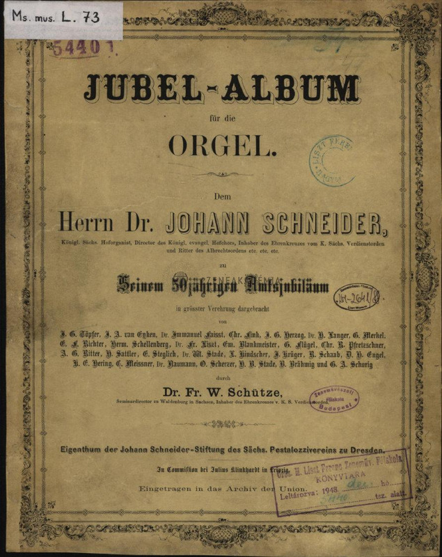 Collection of organ pieces from 28 authors edited by Friedrich Wilhelm Schütze, issued by Julius Klinkhardt, Leipzig [1861]. Liszts Andante religioso is on pp. 66.-68. Liszts corrections are an all the three pages.