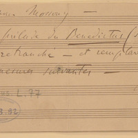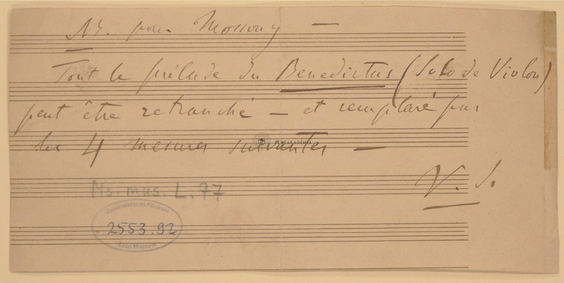 Four bars in case of ommitting the violin solo introduction. On the recto two bars for "Violon Solo" and "Clarinettes en la", then two further bars for orchestra ("Violon, Violoncelles et autres Instrumens, Entrée des voix comme dans la partition page 2 du Benedictus". All the four bars written on a double system. On the verso instructions for Mosonyi.