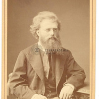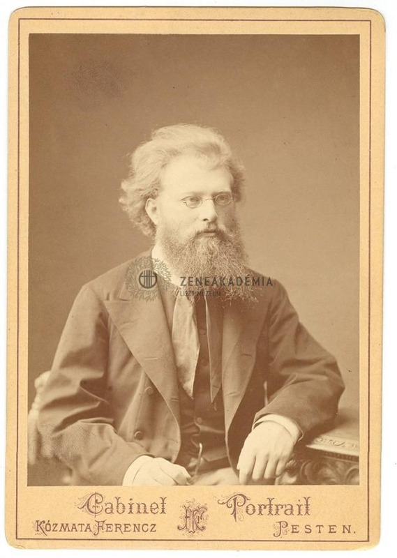 The artist dressed in suit and silk neckerchief, he has wears eyeglasses and a long beard. He sits at the table and leans on its corner. Below the photograph, imprint: "Cabinet Portrait KÓZMATA FERENCZ PESTEN"