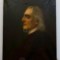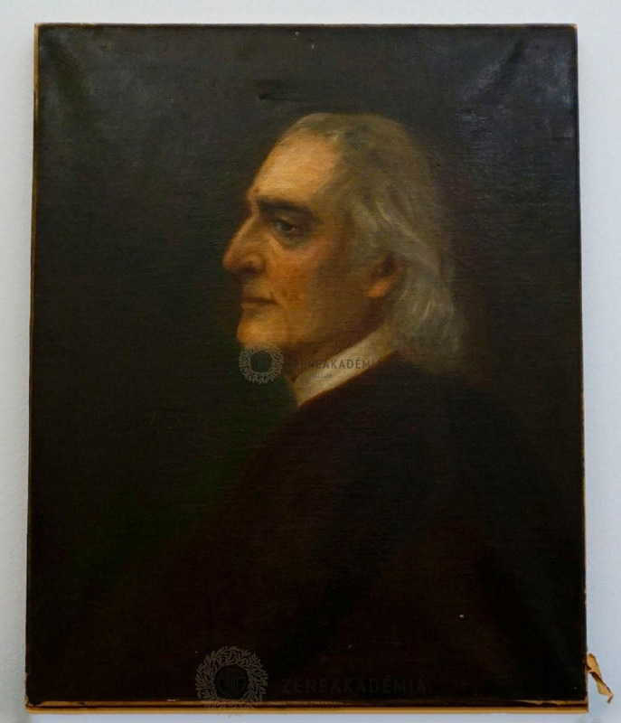 - The old Liszt wearing his cassock is seen in left profile on a dark green backround. Mounted.