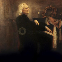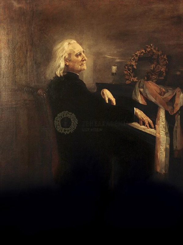 The old master dressed in cassock sits at the piano. On the instrument, a laurel wreath decorated with Hungarian national ribbon is visible. In ornate frame.