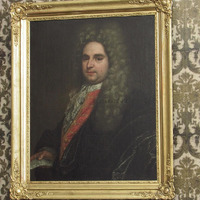 Middle aged man with light brown long whig, dressed in red vest and dark jacket. In his right hand he holds a document.