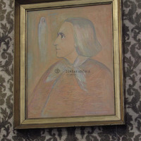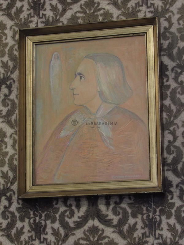 The relatively young Liszt is represented in left semi-profile. His eyes look upwards, where the blurred image of the Holy Virgin is visible. The basic tone of the painting is terracotta orange with bourdon and pale violet nuances.