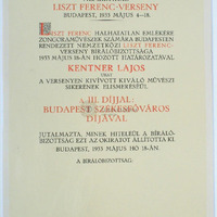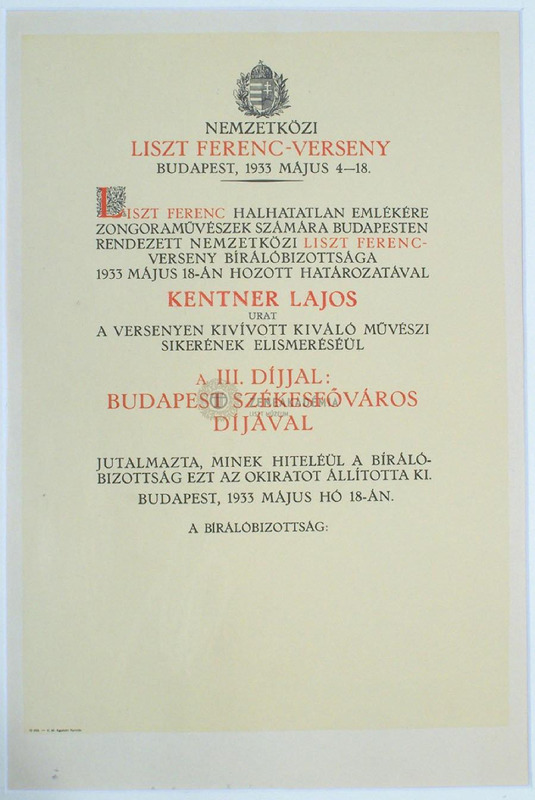 Diploma for Lajos Kentner who won third prize (the prize of the Hungarian capital Budapest) at the International Liszt Piano Competition of 1933.