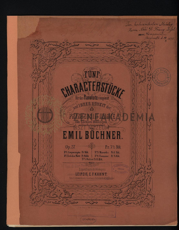 With manuscript dedication to Liszt: "Dem hochverehrten Meister Abbé Dr Franz Liszt/ vom Componisten / Bayreuth d. 14/8 1875." No. 1. Impromptu; No. 2. Lied ohne Worte; No. 3. Mazurka; No. 4. Romanze; No. 5. Walzer. 2 copies with different measurements and shelf numbers.