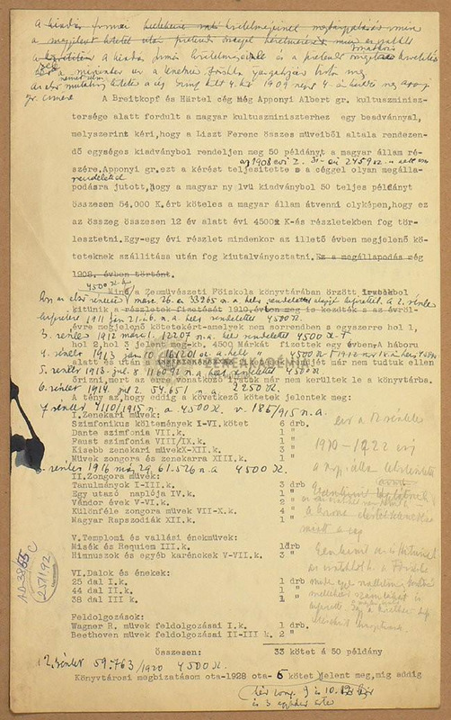 Printed and hand-written notes of the volumes of the Liszt complete edition ordered in 50 copies by Count Albert Apponyi, Minister of Religion and Public Education, from Breitkopf & Härtel, Leipzig in the name of the Hungarian state and their instalments. No date.The title of the volumes, the year of publication and payment are indicated.