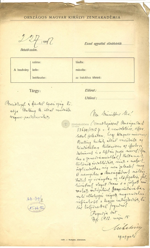 Letter of Ödön Mihalovich, director of the Academy of Music-letter, to the Minister of Religion and Public Education informing him that should the new edition of Wagner’s works revised by Michael Balling – early music dramas and purely instrumental works – be ordered they could be placed in the music collection of the Academy of Music. Signed by Ödön Mihalovich.