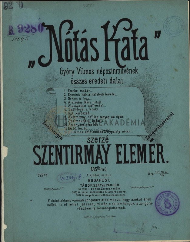 "Nótás Kata", 135ik mű. Győry Vilmos népszinmüvének összes eredeti dalai. Énekhangra zongorakisérettel ["Songbird Kata". All original songs from Vilmos Győrys folkplay, Op. 135. For voice and piano].