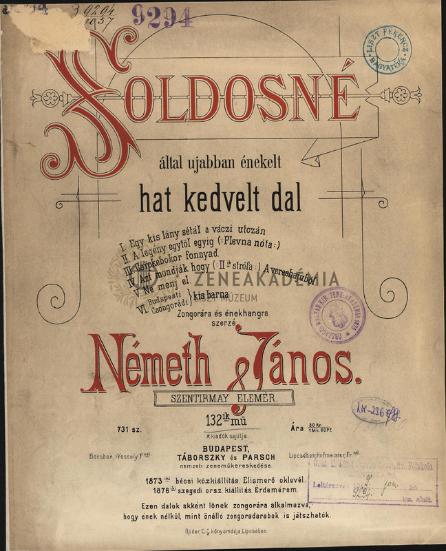 Soldosné által ujabban énekelt hat kedvelt dal. Zongorára és énekhangra, 132ik mű [Six favourite songs recently sung by Mrs. Soldos. For piano and voice. Op. 132.].