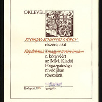 - Diploma of the educational publisher Tankönyvkiadó for György Szomjas-Schiffert.