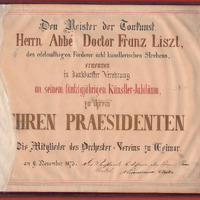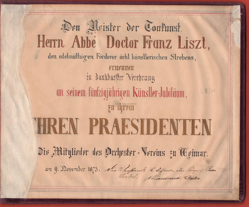 - The "Orchester-Verein" of Weimar congratulates Liszt, its honorary president, on the 50th anniversary of his artistic jubilee.