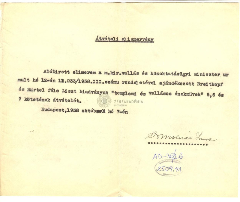 - Dr. Imre Molnár’s acknowledgement of receipt of one copy each of vols. 5, 6 and 7 (Sacred Choral Music) of the Liszt complete edition.