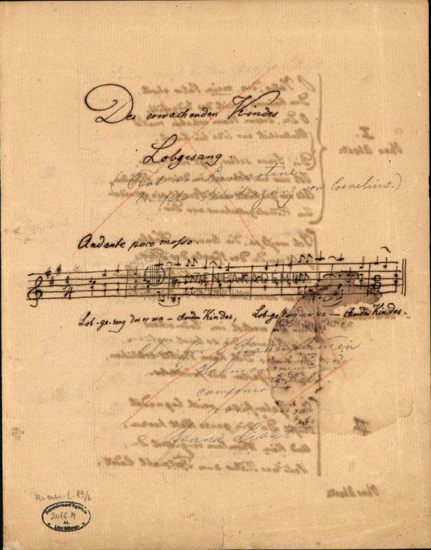 Appendix of Ms mus L 89/a: German translation of the poem by Peter Cornelius. Des erwachenden Kindes Lobgesang, autograpf with 8 bars of music quotation. 1 separate bifolio.