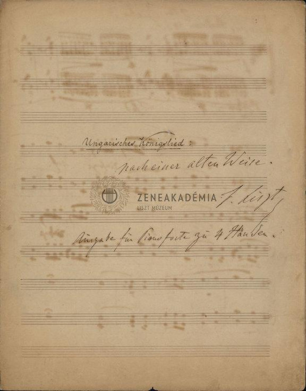 The title-page of the piano version for four hands is autograph, the music itself is a copy by Géza Allaga, with Liszts numerous additions and corrections on the title-page and in the score. 4 bifolios, title-page and 15 pages, 10-stave music-paper. Title-page (with Liszts autograph signature and additions), from 1st to 15th: numbered pages, the end is missing. Without date and place.